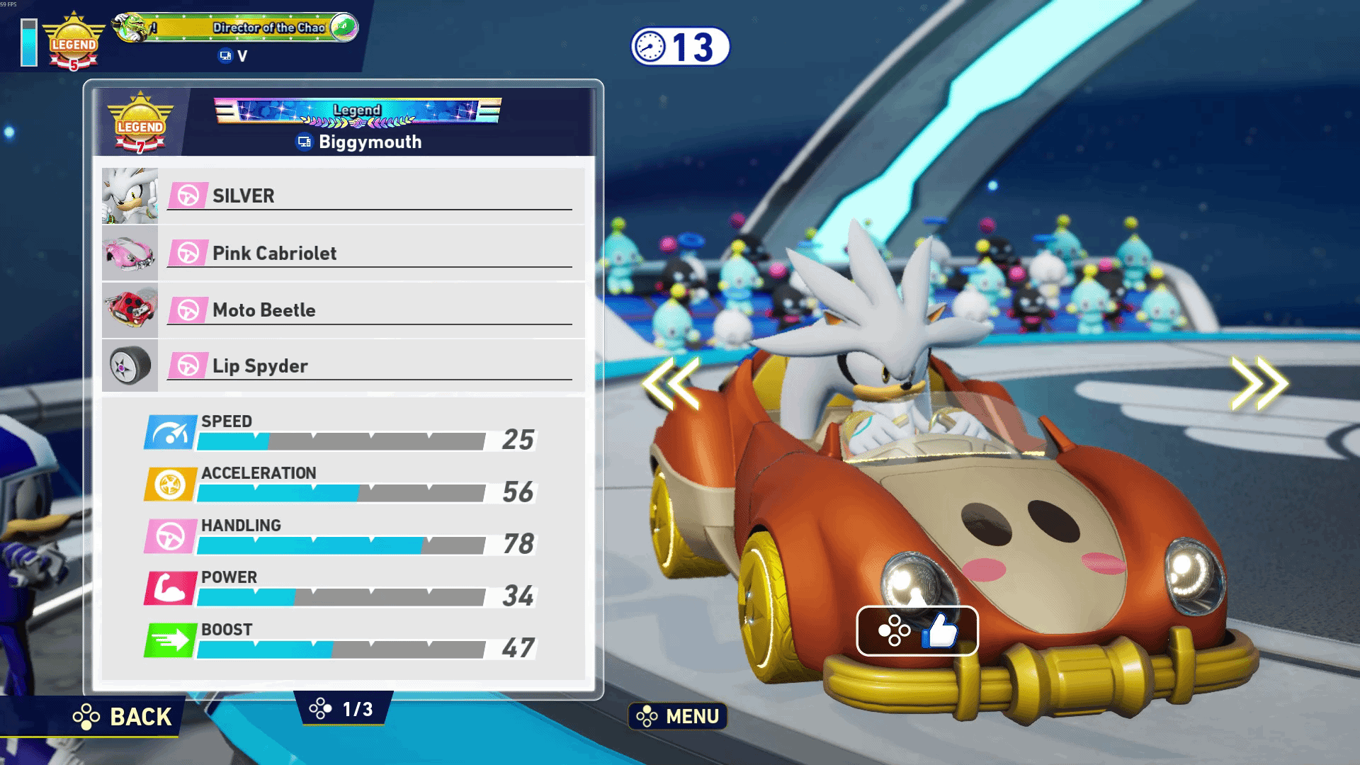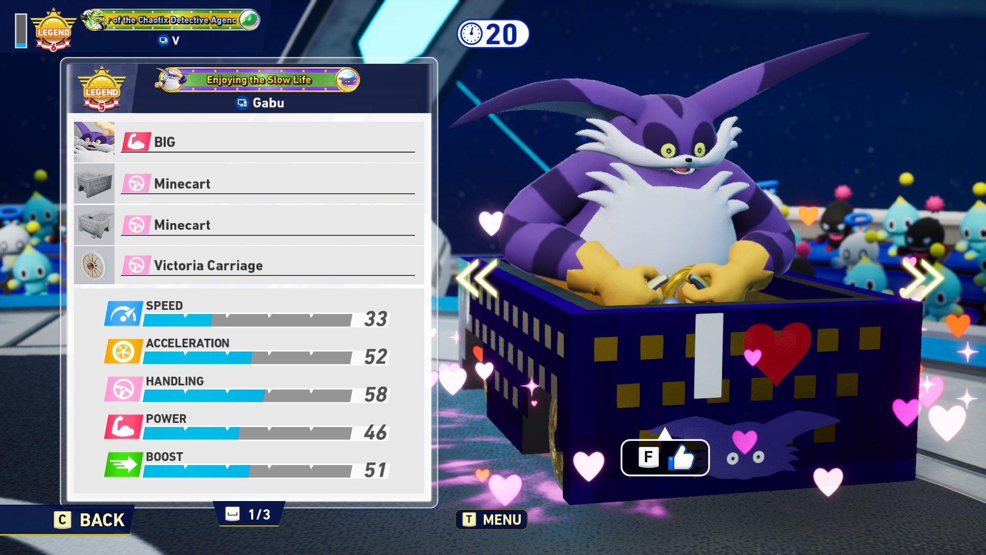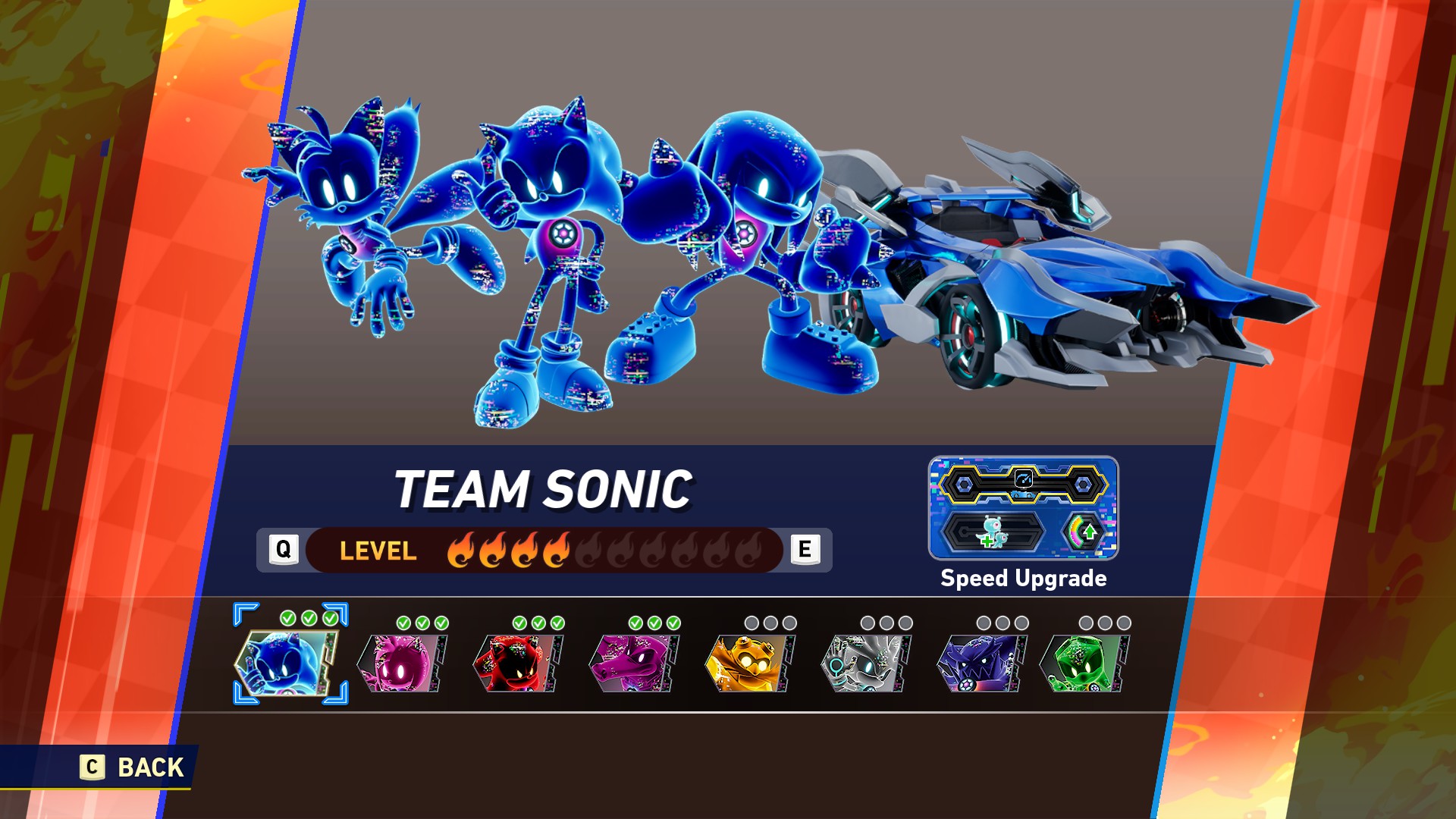 I really like how each type really is innately unique from eachother, aside from their respective stats stats, they also have modifiers to their drift and acceleration which you can very much feel. A speed car drives like a speed car, you can dump as much as you want into the Speed stat for any other vehicle type, but you can't make It feel like a Speed car, If that makes sense, and So on and so forth for each Vehicle type. I play a little bit of everything, but I play Power vehicles the most, Given that maintaining Rings is so crucial in this game, It's fun to knock people around and make them lose rings while not losing them myself; at the cost of having shot handling (which I like anyways.) Occassionally, bumping into someone and slowing them down can steal me a win which is super funny.