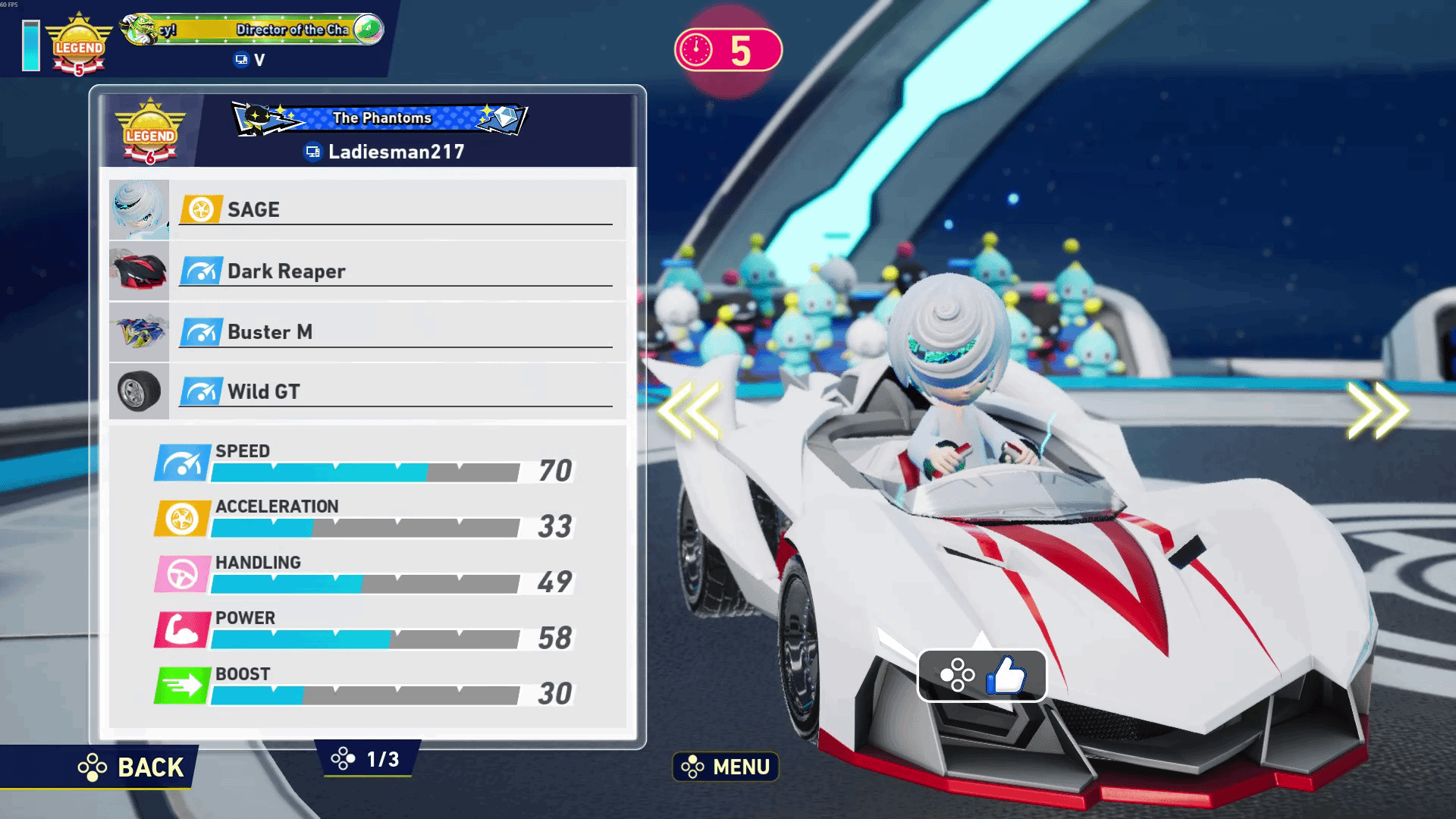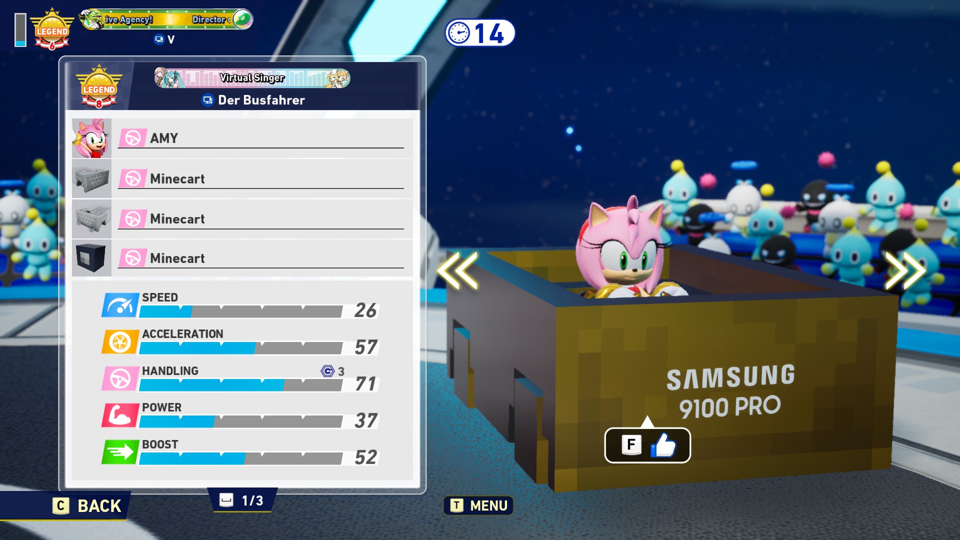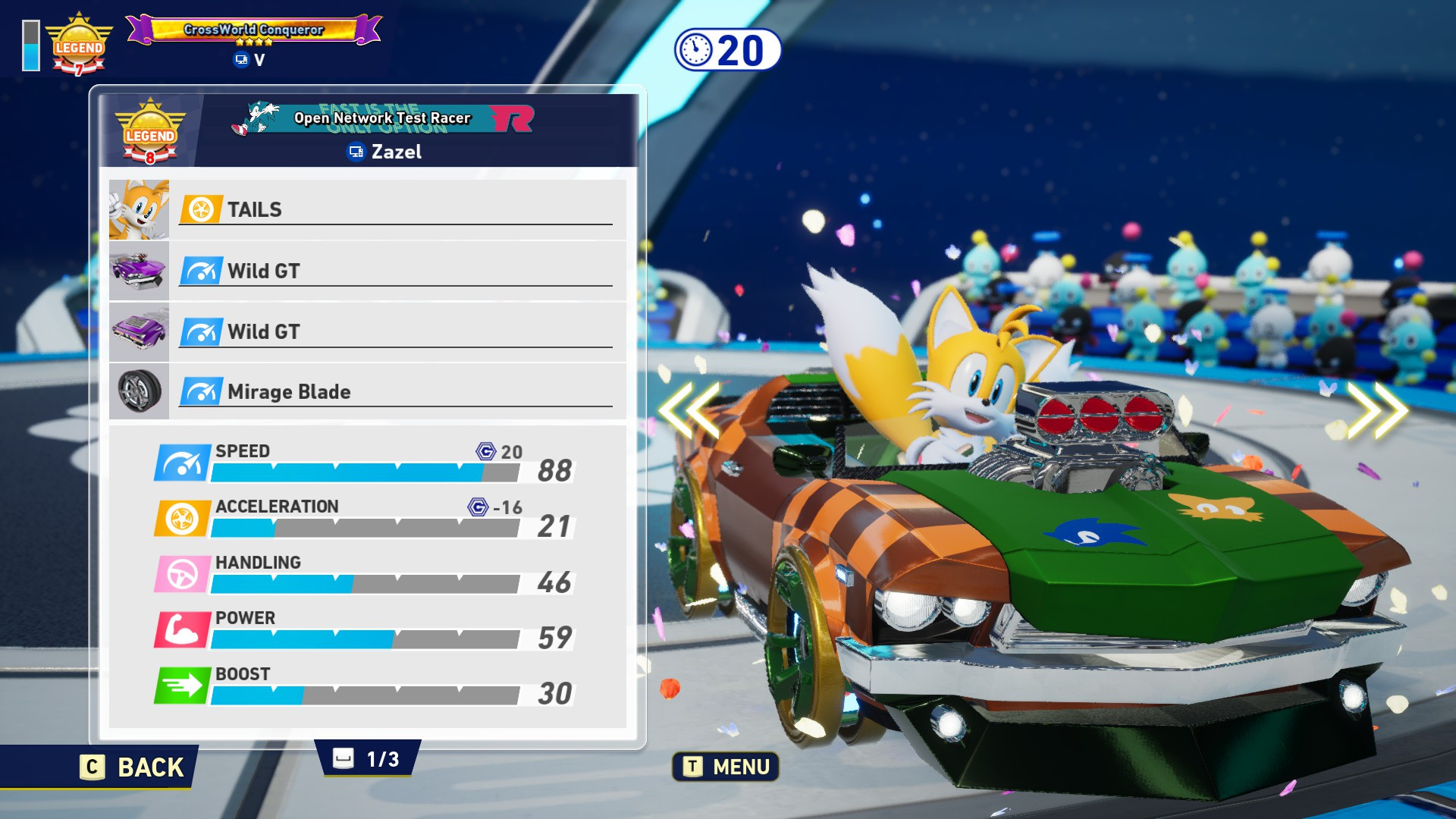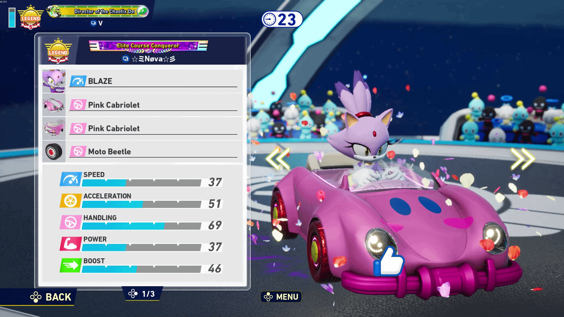 I really like how each type really is innately unique from eachother, aside from their respective stats stats, they also have modifiers to their drift and acceleration which you can very much feel. A speed car drives like a speed car, you can dump as much as you want into the Speed stat for any other vehicle type, but you can't make It feel like a Speed car, If that makes sense, and So on and so forth for each Vehicle type. I play a little bit of everything, but I play Power vehicles the most, Given that maintaining Rings is so crucial in this game, It's fun to knock people around and make them lose rings while not losing them myself; at the cost of having shot handling (which I like anyways.) Occassionally, bumping into someone and slowing them down can steal me a win which is super funny.