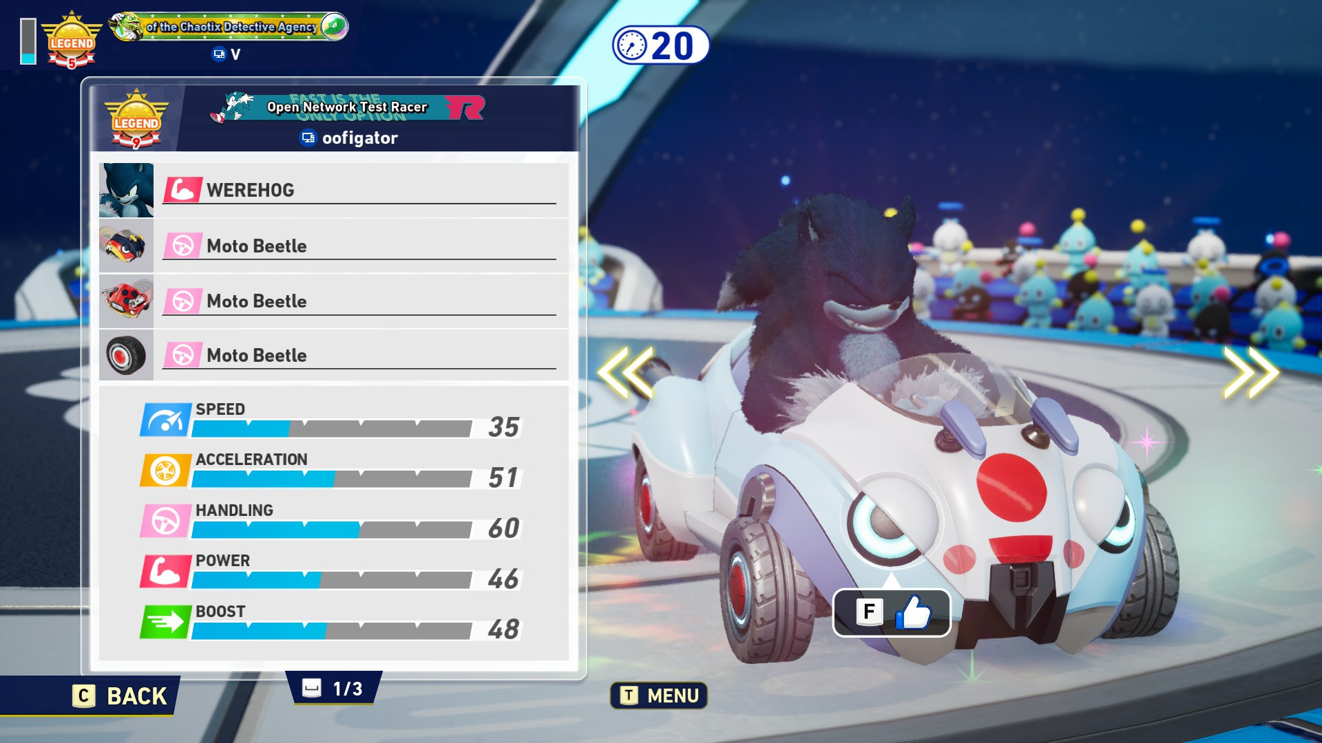 Oh, for some reason there is also the “Friendships” menu, unlocked after beating all the Grand Prix cups as well. You earn “Donpa Tickets” after each race, which are mainly used for buying car parts, but if you really want to, you can also cough up your hard-earned tickets to the Sonic cast. Lovely What you get are titles, decals, and unlocking the aforementioned Weird AI racer skin that correspond to the character your gifting to. The ticket requirements are tame enough at first, but end up to be ludicrously high as you spend more and more, for context, you can get an average of 10-30 tickets in a normal race, and to get all the rewards for a character you need about 50000k tickets. Obviously this is meant to be a long term goal to spend excess tickets on after playing for a long time... but I see a good amount of people in the online lobbies with the titles you get for spending 50000k tickets on a character, and that scares me.