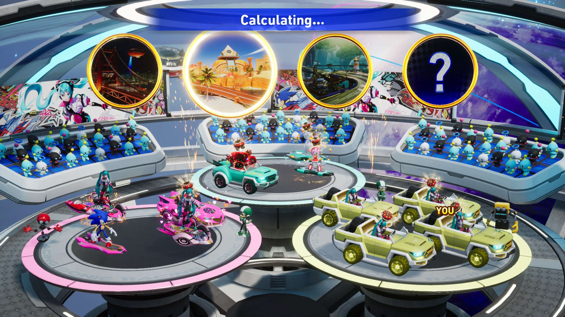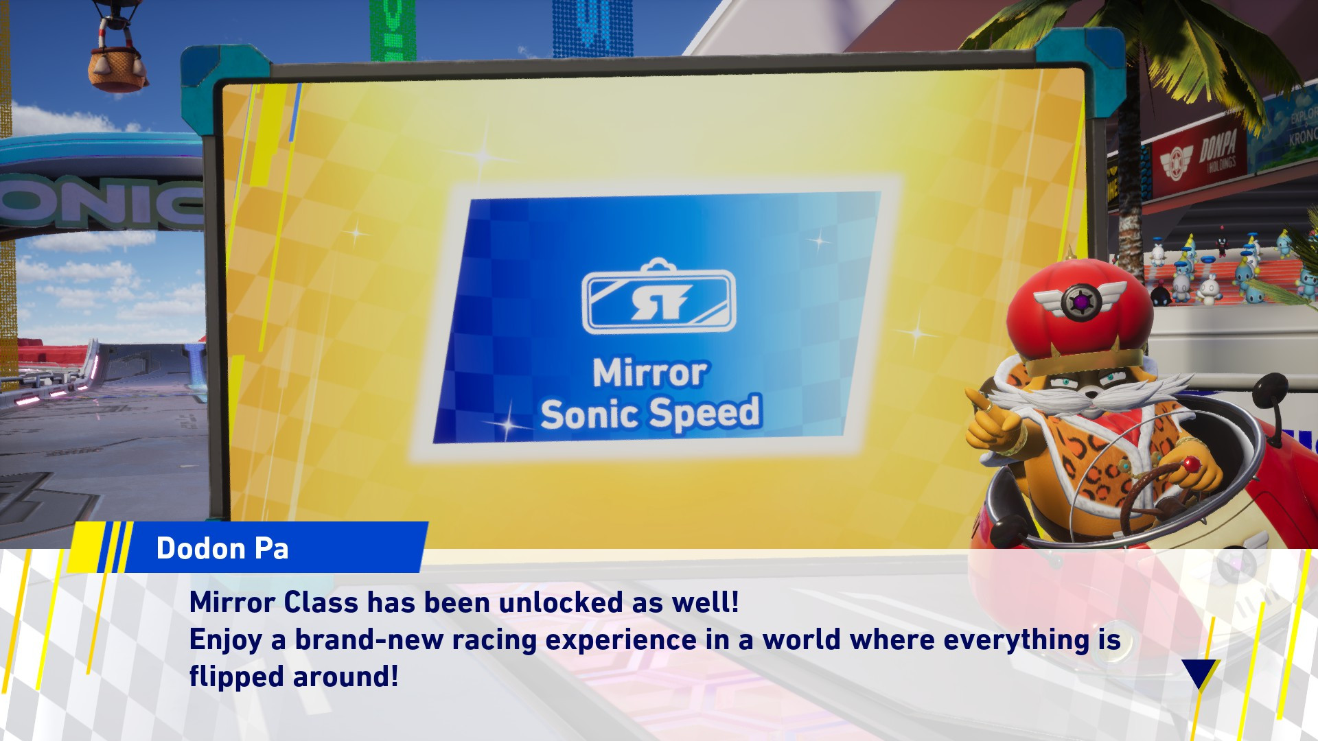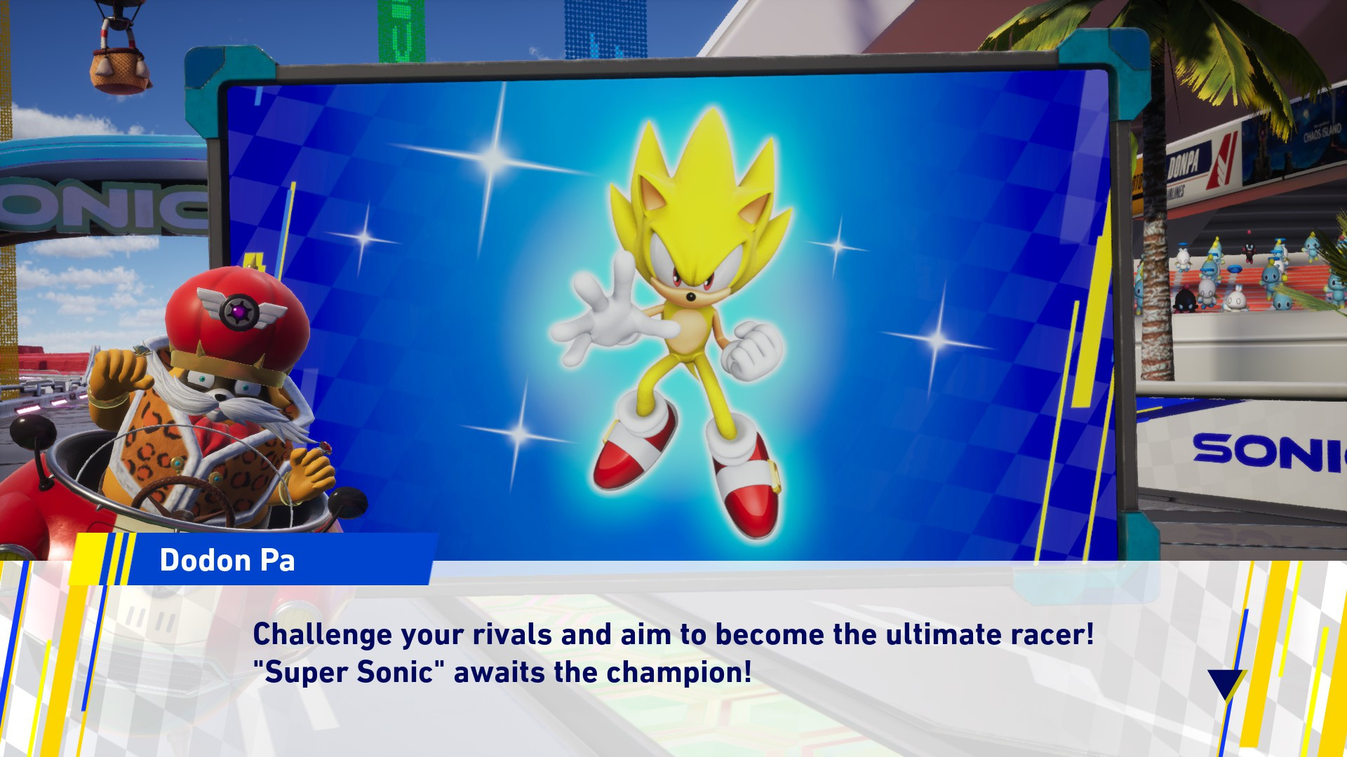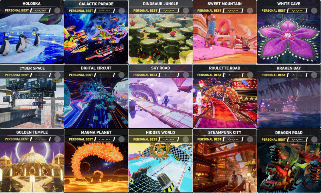 I was really happy to see the return of stages from previous Sonic games reimagined here, Radical Highway and Metal Harbor from Adventure 2, Sweet Mountain from Colors, the grand return of Apotos, Holoska, and Dragon Road from Unleashed, alongiside more deeper cuts such as Dinosaur Jungle and Kraken Bay from Secret Rings, White Cave from Riders, and even Hidden World from Lost World. There's even a whole "secret" cup dedicated to the 3 most recent Sonic titles, Using Kronos Island from Frontiers (Alongside a Cyber Space Crossworld), Northstar Islands from Superstars, and White Space from Shadow Generations. Oh, and Mystic Jungle from Forces is here, I guess.