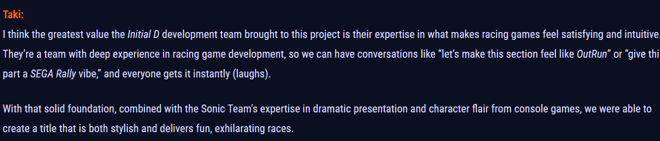 Reading this the first time after playing made me go "dang, they really pulled all the stops for this" and It very much shows. It was recently discovered the the cars in this game have a hidden gearshift mechanic which blew my mind further.