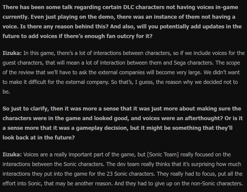 This feels like a cop-out though, even, ultimately, these are still characters the company owns and has the rights for to varying extents, while I do get that even internally there's still a lengthy back and forth approval process to make sure everything is "correct" about a characters appearance outside of their source, but like, even If It's arduous, or expensive, couldn't Sega have just, done It anyways? Regardless of how the Sonic series performs, Sega still is a multi-billion dollar company at the end of they day, so It's just egregious that they didn't want to get voices for the Crossover characters they already own.