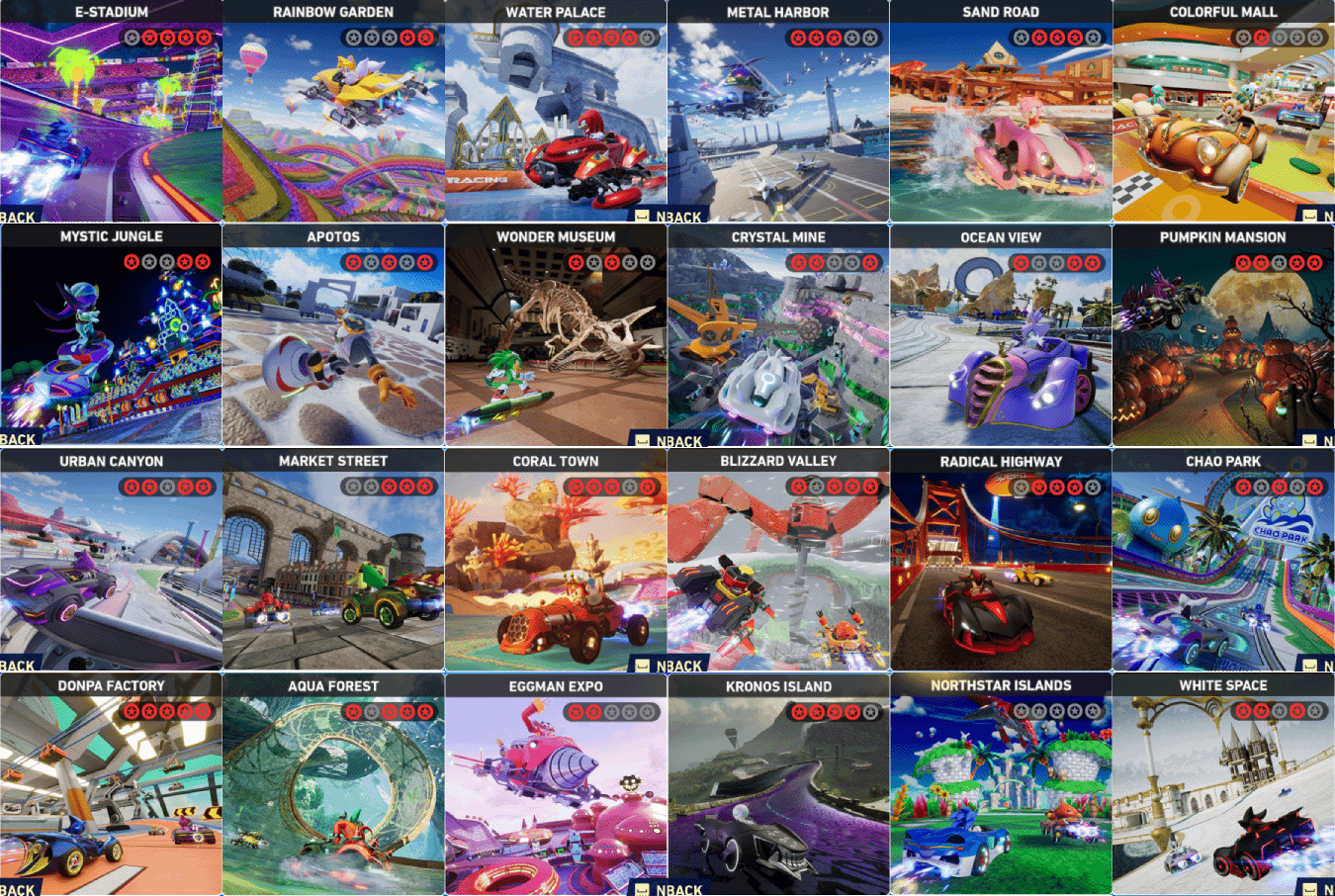 Also, They actually made completely new tracks based on original setpieces aswell, which fill up the rest of the stage list. I like them alot, It's a little glimpse into Sonic's world that would probably never be seen otherwise. Mundane locales like Wonder Museum, Colorful Mall, and Chao Park; or more extravagant places like Golden Temple, Steampunk City, and Coral Town. locations that would exist in this world, but would probably never be playable in a main game. It's just nice to see some more worldbuilding in this series, from a Racing game spin-off of all things.