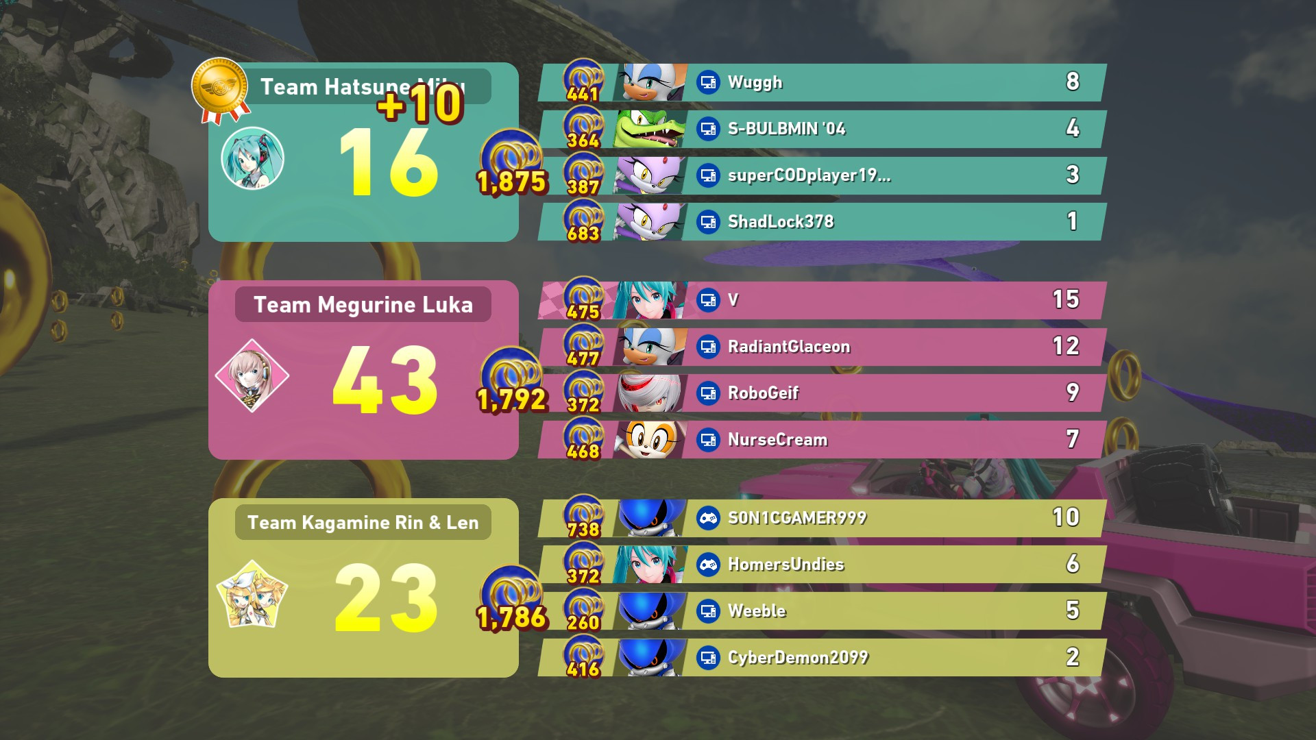 You can also exploit the objectives of these events aswell and just scam yourself into a win without particularly trying, stuff like driving around in circles and collecting rings while everyone else races and focuses on the objective naturally. They can get last place, but have their teammates rank well, and win purely because they got an ungodly number of rings from just, not racing, It's not cheating, It's just uncouth. People do this cause they really wanna get those Top 1000/100/10 titles, I've definitely no-lifed games before, but I don't get why people can get so obsessed over something like a title, and doing everything they can to get It.